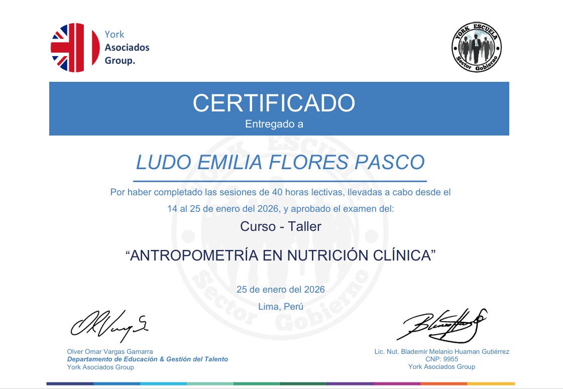Certificados «Antropometría en Nutrición Clínica» – LUDO EMILIA FLORES PASCO 25 de enero de 2026 Publicado por Webmaster York 25 Ene Ludo Emilia Flores Pasco DNI: 17883834 Nota: 18 25 de Enero de 2026 Búsqueda descarga