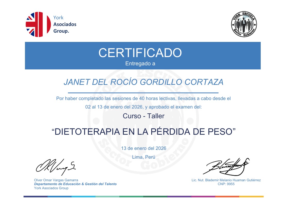Certificados «Dietoterapia en la Perdida de Peso» – JANET DEL ROCÍO GORDILLO CORTAZA 17 de enero de 2026 Publicado por Webmaster York 17 Ene JANET DEL ROCÍO GORDILLO CORTAZA Nota: 18 13 de Enero de 2026 Búsqueda descarga