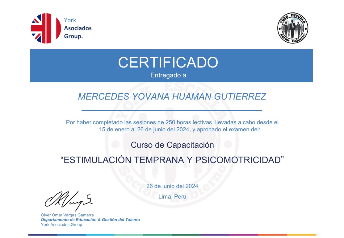 Certificados “ESTIMULACIÓN TEMPRANA Y PSICOMOTRICIDAD”-MERCEDES YOVANA HUAMAN GUTIERREZ 12 de junio de 2025 Publicado por Webmaster York 12 Jun MERCEDES YOVANA HUAMAN GUTIERRE DNI: 46721612 Nota: 18 26 de Junio de 2024 Búsqueda descarga