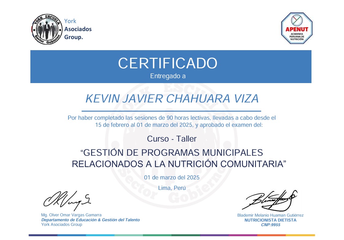 Certificados «Gestión de Programas Municipales en Relación a la Nutrición Comunitaria» – Kevin Javier Chahuara Viza 8 de marzo de 2025 Publicado por Webmaster York 08 Mar Kevin Javier Chahuara Viza DNI: 71042460 Nota: 18 01 de Marzo de 2025 descarga tu certificado Búsqueda
