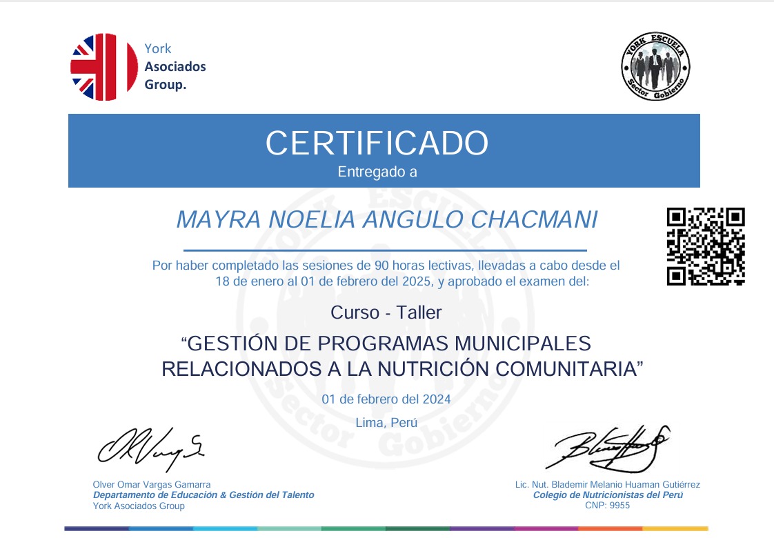 Certificados «Gestión de Programas Municipales en Relación a la Nutrición Comunitaria» – Mayra Angulo Chacmani 5 de febrero de 2025 Publicado por Webmaster York 05 Feb Mayra Noelia Angulo Chacmani Nota: 18 01 de febrero de 2025 Descarga Certificado Búsqueda