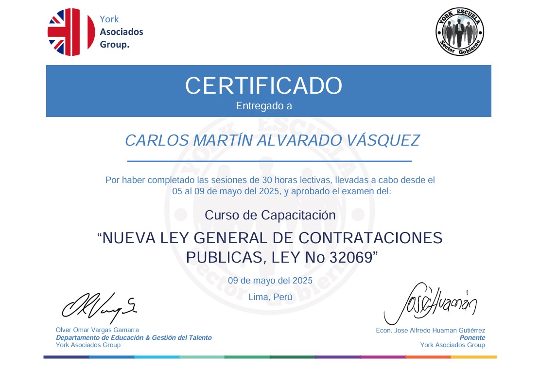 Certificados “NUEVA LEY GENERAL DE CONTRATACIONES PUBLICAS, LEY No 32069”-Carlos Martín Alvarado Vásquez 23 de mayo de 2025 Publicado por Webmaster York 23 May Carlos Martín Alvarado Vásquez DNI: 05389046 Nota: 18 09 de Mayo de 2025 Búsqueda descarga