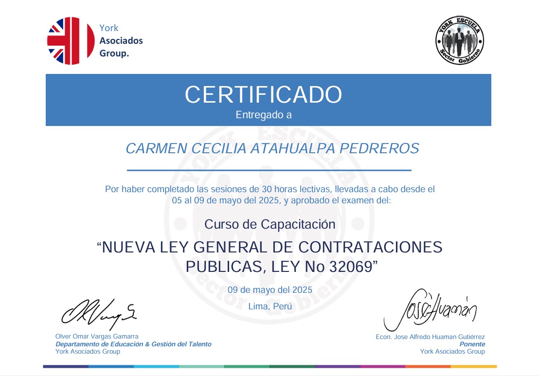 Certificados “NUEVA LEY GENERAL DE CONTRATACIONES PUBLICAS, LEY No 32069”- Carmen Cecilia Atahualpa Pedreros 23 de mayo de 2025 Publicado por Webmaster York 23 May Carmen Cecilia Atahualpa Pedreros DNI: 42939954 Nota: 16 09 de Mayo de 2025 Búsqueda descarga