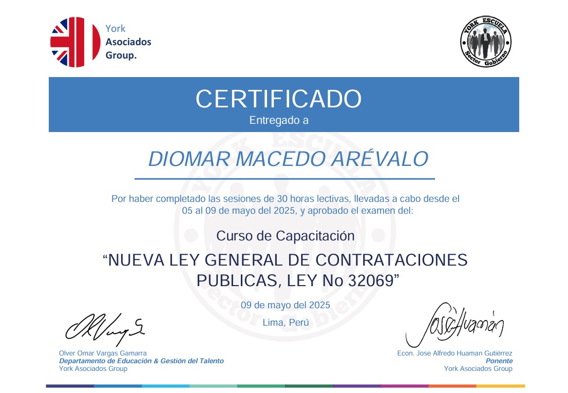“NUEVA LEY GENERAL DE CONTRATACIONES PUBLICAS, LEY No 32069”- Diomar Macedo Arévalo