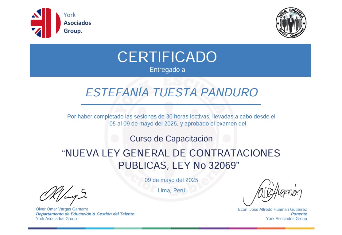 Certificados “NUEVA LEY GENERAL DE CONTRATACIONES PUBLICAS, LEY No 32069”- Estefanía Tuesta Panduro 23 de mayo de 2025 Publicado por Webmaster York 23 May Estefanía Tuesta Panduro DNI: 70679562 Nota: 15 09 de Mayo de 2025 Búsqueda descarga