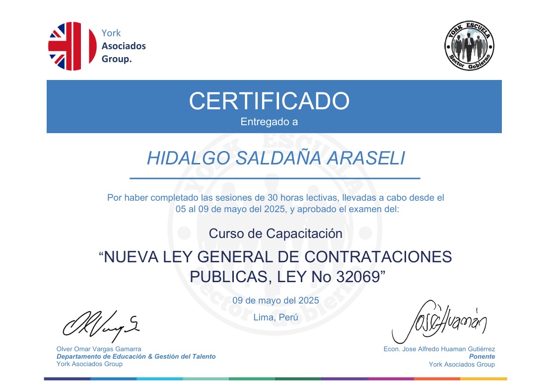 Certificados “NUEVA LEY GENERAL DE CONTRATACIONES PUBLICAS, LEY No 32069”- Hidalgo Saldaña Araseli 26 de junio de 2025 Publicado por Webmaster York 25 Jun Hidalgo Saldaña Araseli Nota: 15 09 de Mayo de 2025 Búsqueda descarga