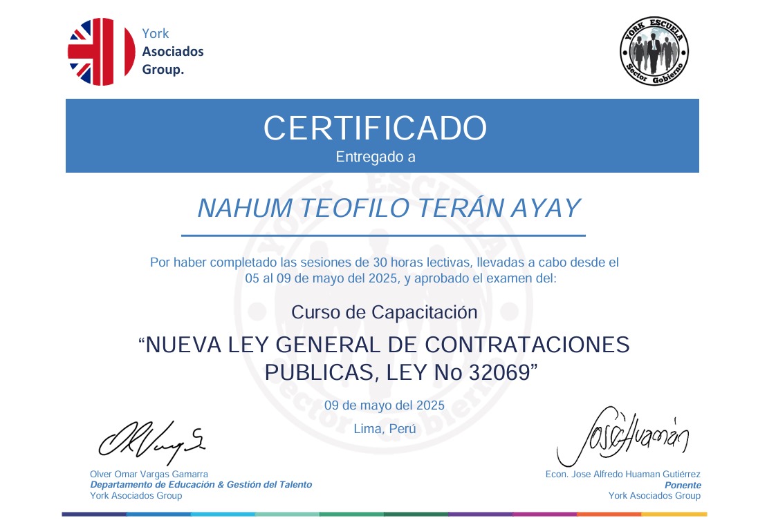 Certificados “NUEVA LEY GENERAL DE CONTRATACIONES PUBLICAS, LEY No 32069”- Nahum Teofilo Terán Ayay 23 de mayo de 2025 Publicado por Webmaster York 23 May Nahum Teofilo Terán Ayay DNI: 05617778 Nota: 18 09 de Mayo de 2025 Búsqueda descarga