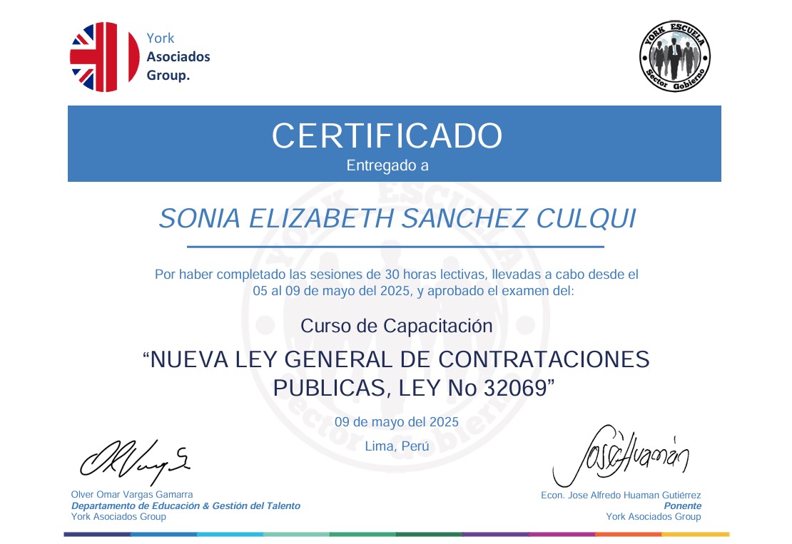 Certificados “NUEVA LEY GENERAL DE CONTRATACIONES PUBLICAS, LEY No 32069”- Sonia Elizabeth Sanchez Culqui 23 de mayo de 2025 Publicado por Webmaster York 23 May Sonia Elizabeth Sanchez Culqui DNI: 05580863 Nota: 18 09 de mayo de 2025 Búsqueda descarga